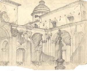 1944, pencil on paper, 10x7.75in. Inscribed verso "The quietest place on earth I think. Not too Baroque either. Monastery Italy"
