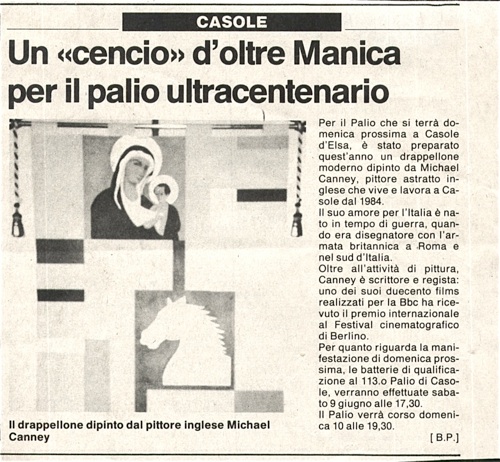 “Horse Committee” have been (like the Welsh band in “Decline and Fall” – huddled nervously and muttering) to see my banner for the [Casole d’Elsa] Palio. General excitement – and approval. Greatest thing since Duccio frescoed the church, apparently, and much bigger than anything they’ve had before… [as it featured in a local newspaper, below]